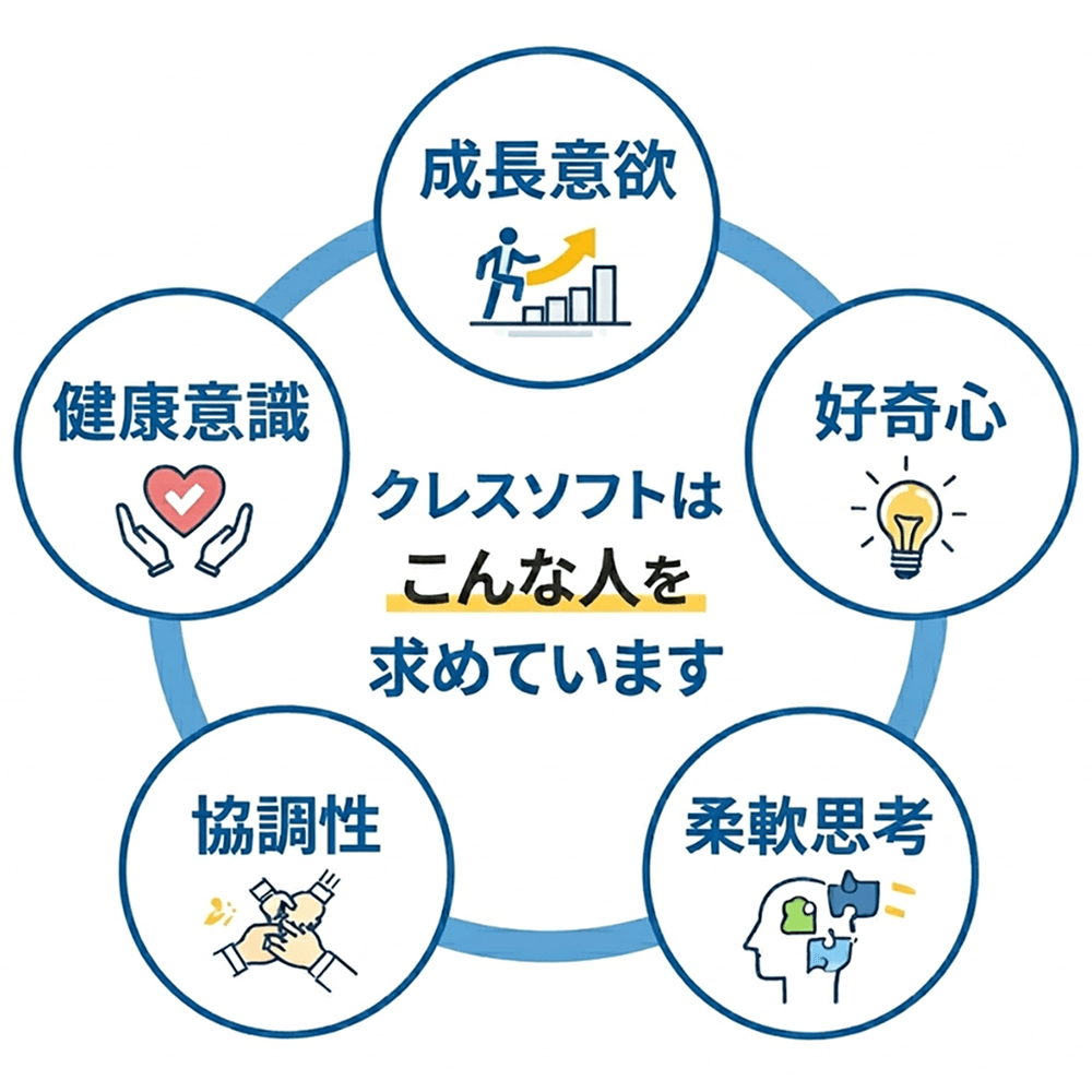 クレスソフトでは、社員一人ひとりの人格や価値観を尊重し、持続的なキャリア形成を支援しています